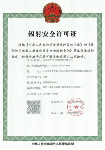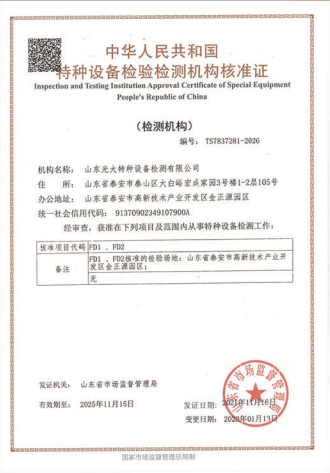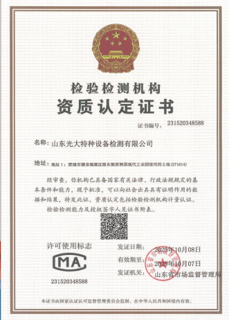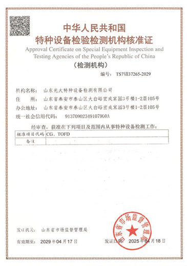 山東光大特種設備檢測有限公司是經(jīng)山東省市場監(jiān)督管理局核準的甲類B1特種設備綜合檢驗機構。2017年9月30日取得了山東省市場監(jiān)督管理局頒發(fā)的《檢驗檢測機構資質認定證書》。2018年2月22日取得了山東省市場監(jiān)督管理局頒發(fā)的《特種設備檢驗檢測機構核準證》(起重機械)檢驗檢測資質。2021年11月取得山東省市場監(jiān)督管理局版發(fā)的《特種設備檢驗檢測機構核準證》(安全閥在線、離線)校驗資質。2023年11月取得山東省市場監(jiān)督管理局頒發(fā)的甲類檢驗機構B1《特種設備檢驗檢測機構核準證》,具有壓力容器(RD2...